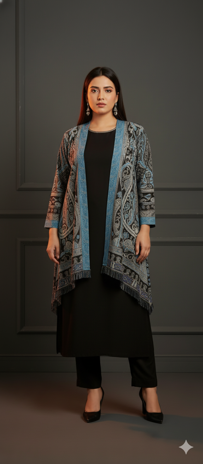 Elevate your wardrobe with this sophisticated ensemble featuring a luxurious velvet shrug paired with a classic black dress. The soft woolen inner layer provides exceptional warmth and comfort, making it ideal for layered styling through transitional seasons. The printed shrug adds visual interest and versatility, allowing you to create multiple looks from a single piece. Perfect for both casual outings and semi-formal occasions, this combination offers effortless elegance with practical functionality.