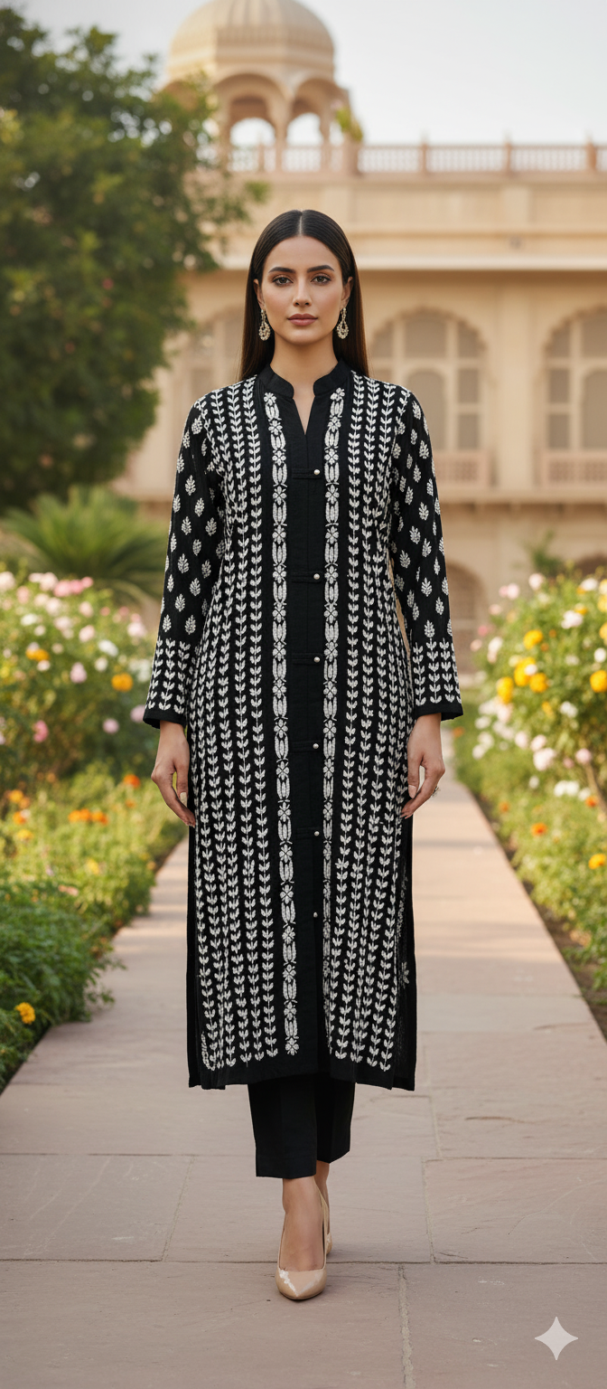 Elevate your ethnic wardrobe with this exquisite modal kurta, showcasing intricate chikankari embroidery that spans the entire garment. Crafted from premium modal fabric, this piece combines breathable comfort with luxurious softness, making it ideal for both casual gatherings and festive occasions. The all-over chikankari work demonstrates masterful craftsmanship, with delicate hand-embroidered patterns creating visual depth and timeless elegance. The heavyweight embroidery ensures durability while maintaining the fabric's natural drape, offering a sophisticated silhouette that flatters all body types. Perfect for those who appreciate traditional artistry with contemporary comfort.
