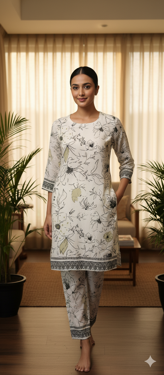 Elevate your wardrobe with this sophisticated printed coordinate set crafted from premium crepe fabric. The fluid drape and refined texture of crepe create an effortlessly elegant silhouette, while the thoughtfully designed print adds contemporary flair. Perfect for both professional settings and upscale casual occasions, this designer piece seamlessly transitions from day to evening. The coordinated styling ensures a polished, put-together look with minimal effort. Crepe's natural breathability and graceful movement make this set an investment in timeless style and comfort.