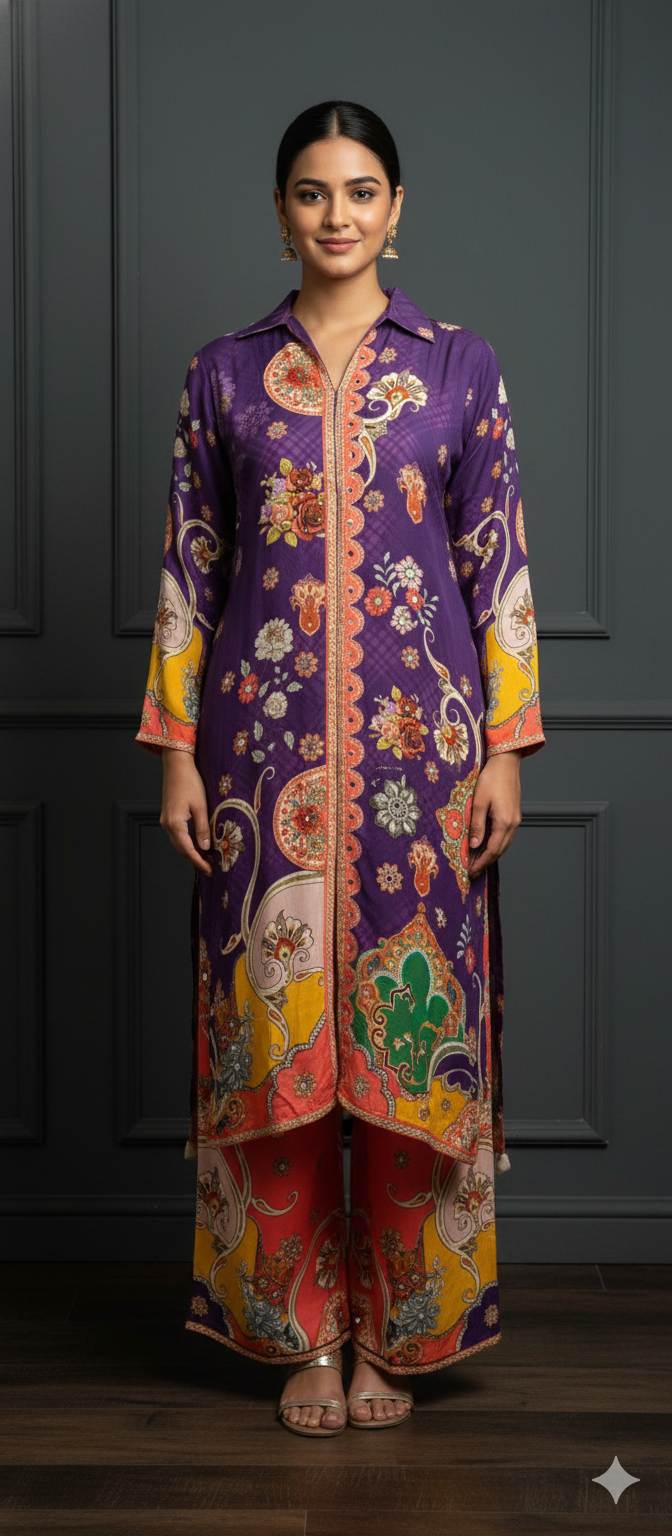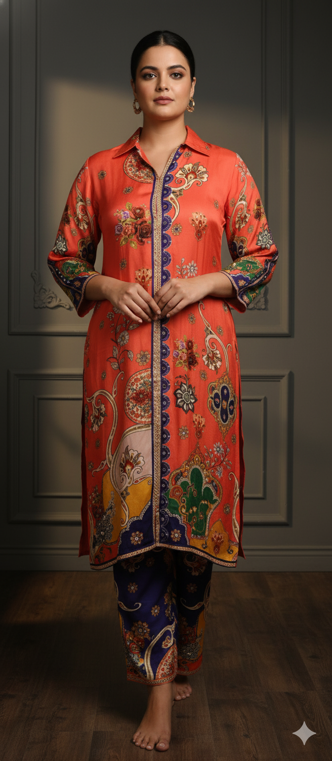 Elevate your ethnic wardrobe with this sophisticated satin crepe printed coord set, designed for the discerning dresser. The ensemble features a striking contrast between the kurta and pant, creating visual depth and contemporary appeal. Intricate mirror work embellishments add a touch of glamour and traditional craftsmanship to this modern silhouette. The luxurious satin crepe fabric drapes beautifully while maintaining its shape, ensuring comfort throughout the day. Perfect for festive occasions, celebrations, or elevated casual wear, this coord set seamlessly blends timeless elegance with current fashion sensibilities.