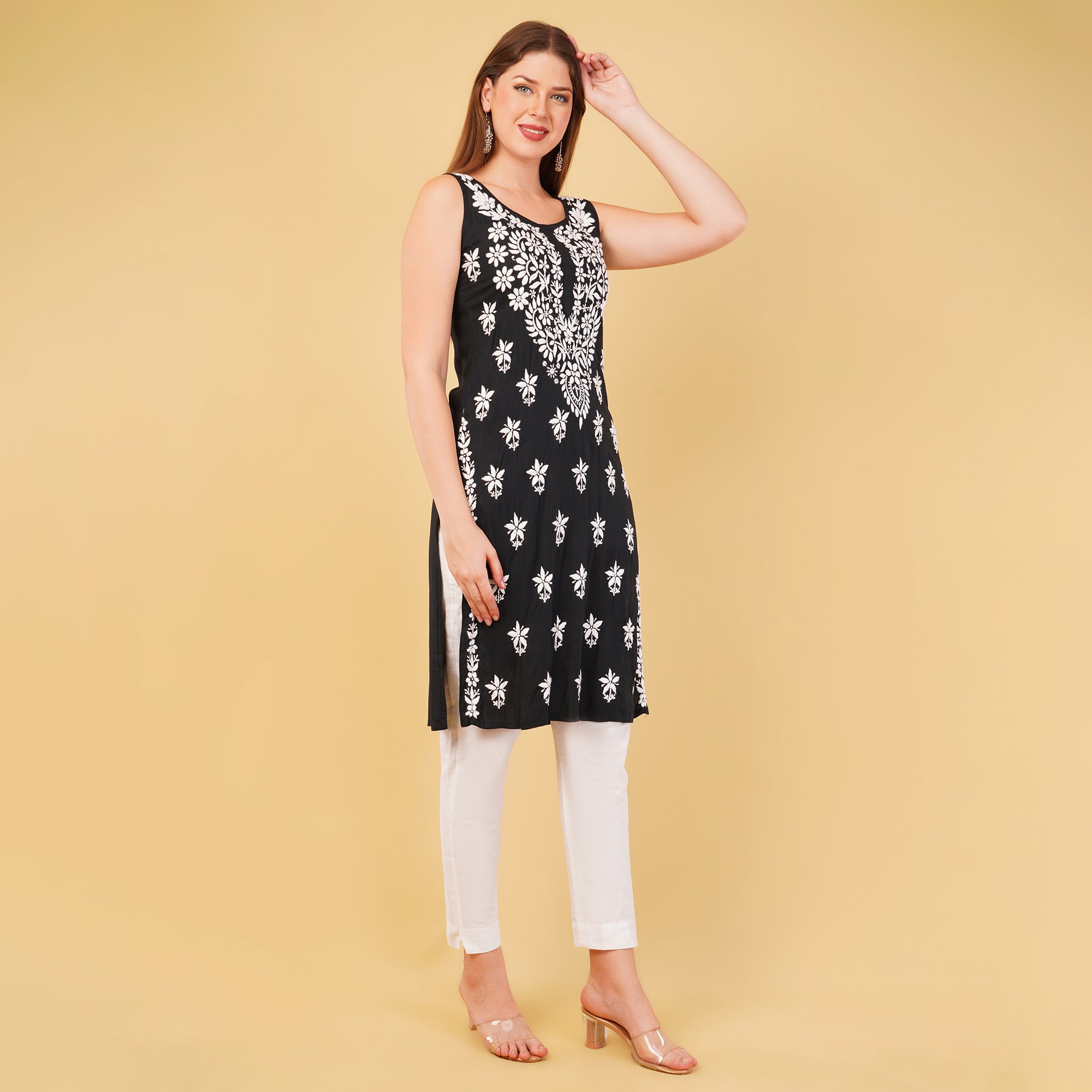 Fabric: Modal CottonType: Sleeveless Straight KurtaNeckline: Round NeckSleeves: Sleeve-lessLength: 110 CmWash Care: Hand Wash SeparatelyNet Qty: 1 N